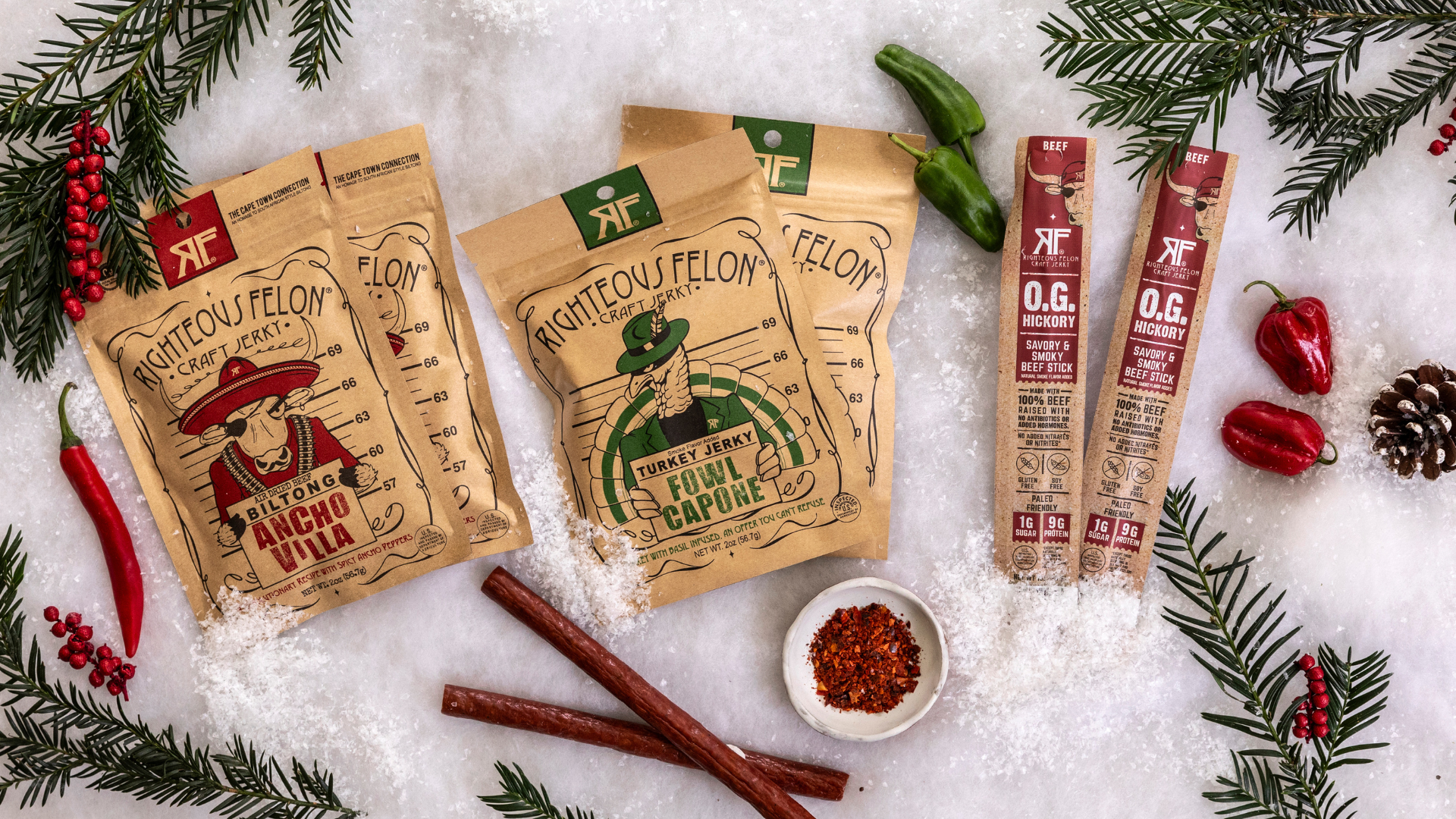 Customers love trying one of everything and gifting our "Whole Shebang" sampler featuring 16 flavors of meat snacks! This craft jerky bundle includes healthy beef jerky, biltong, and craft jerky sticks.