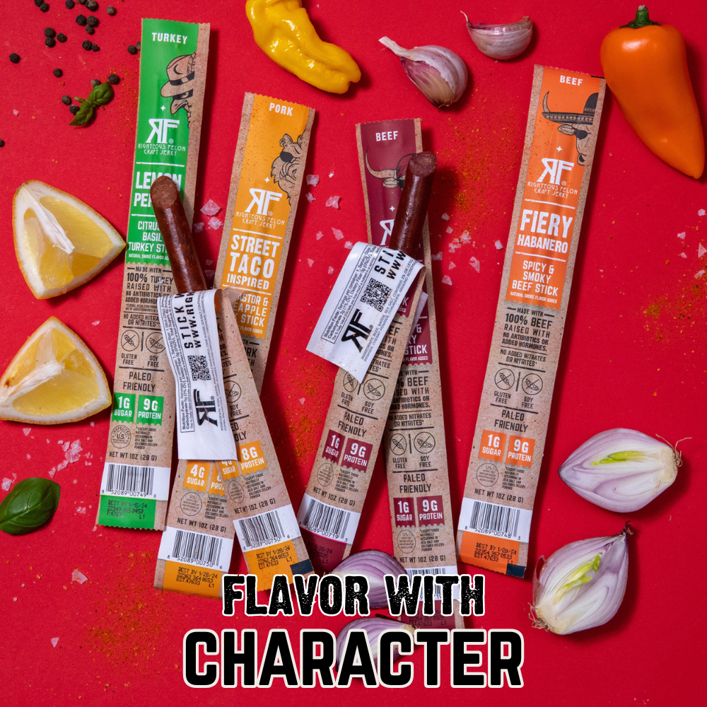 Break into better snacking with the ultimate contraband: the Righteous Felon Stick 24-Pack. Inside, you’ll score 6x sticks of each of our 4 meat stick flavors — smoky O.G. Hickory Beef, Al Pastor inspired Street Taco Pork, fire-breathing Fiery Habanero Beef, and zesty Lemon Pepper Turkey.